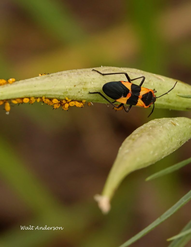 A closer view of a Large Milkweed Bug on a milkweed pod. Those funny little yellow things that look like they came straight from a kid’s computer game are aphids.