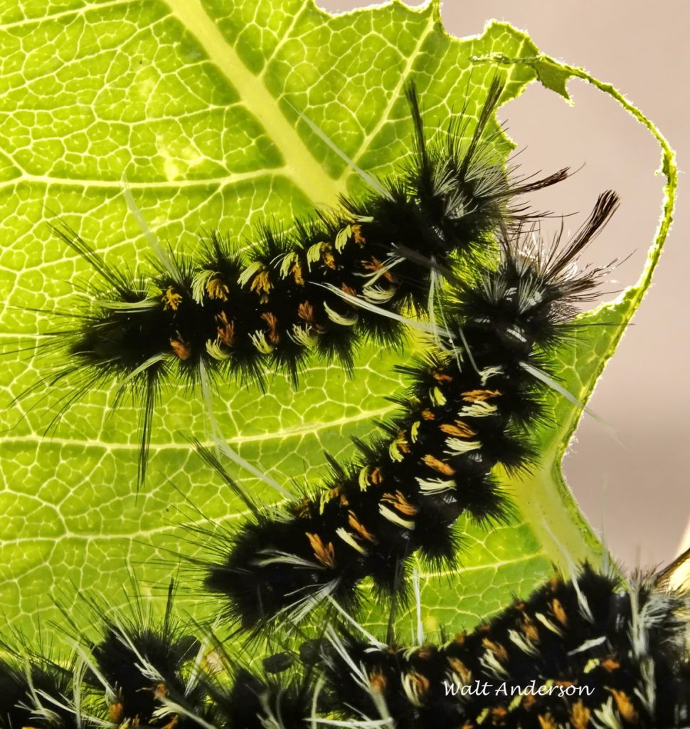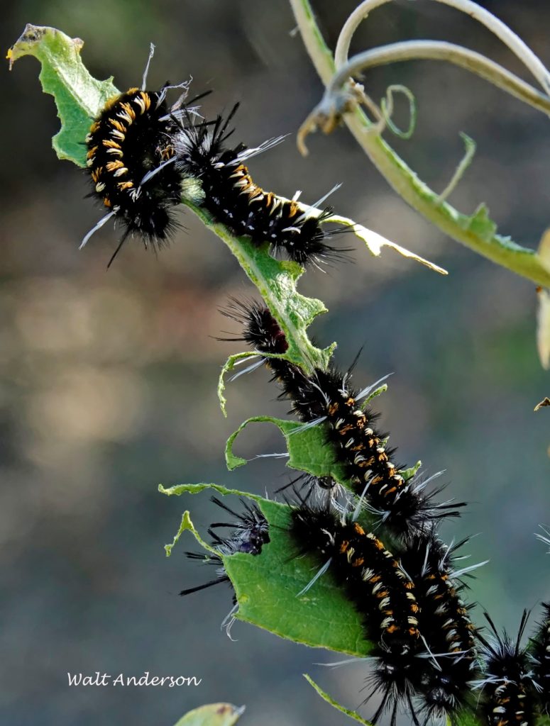 But soon our beautiful plant was covered with hundreds of these bristly critters, who rapidly began to skeletonize the entire plant, leaving nothing for any Monarchs that might come by. The milky latex in the major veins can be sticky for the caterpillars, but the older larvae cut off the latex supply, so “leftovers” are minimal.