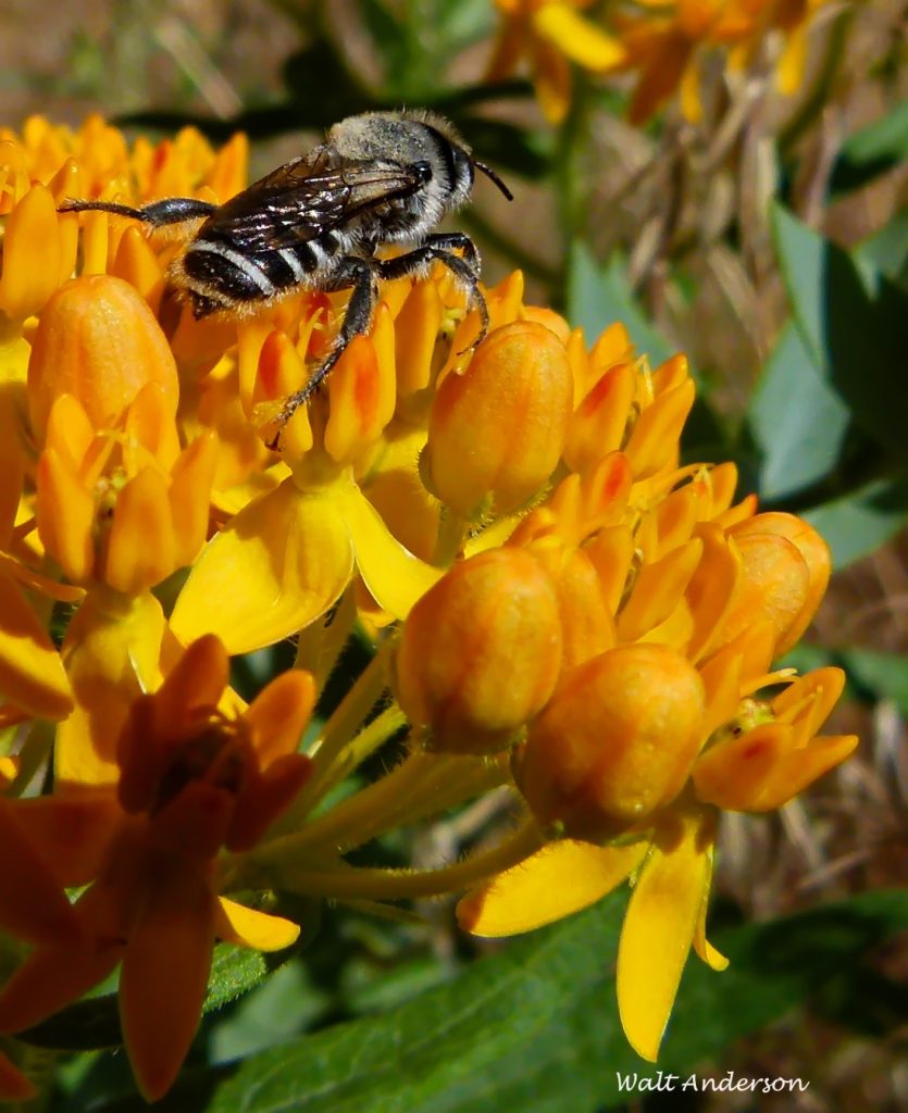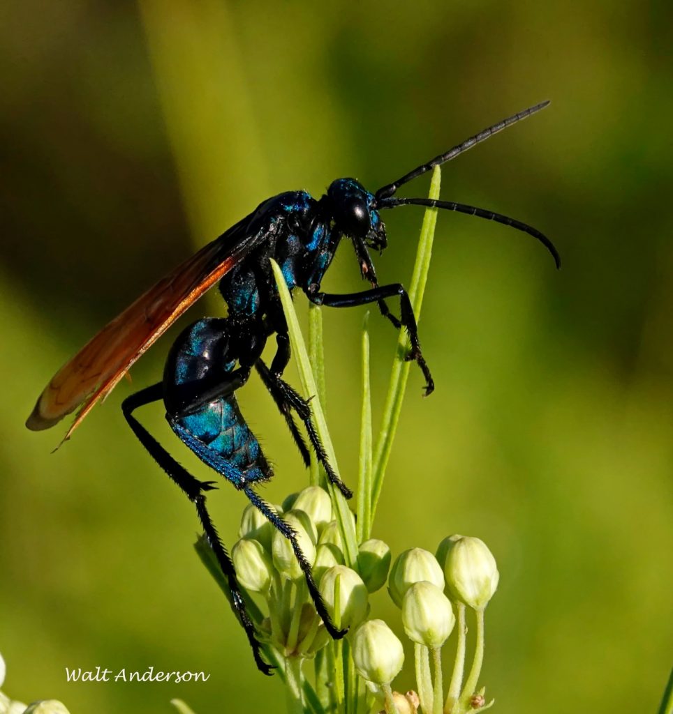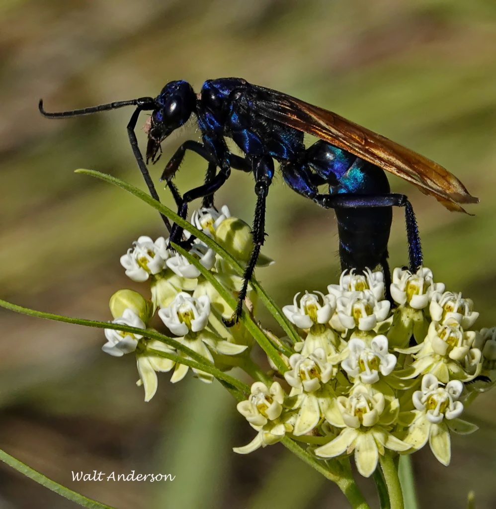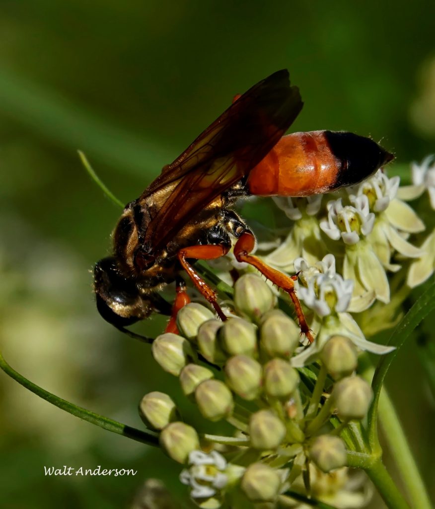 The female Great Golden Digger Wasp is another beauty that nectars on milkweed. She digs a vertical nest tube with horizontal chambers off to the sides. In these, she places stunned crickets or katydids, each planted with an egg that hatches into a larva that feeds again on the living host. Jiminy cricket!