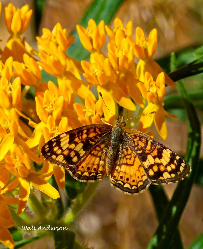 When you find milkweed, stay still and watch the goings-on. Chances are that you will be greatly rewarded for your patience. Here a tiny Mylitta Crescent is visiting its namesake Butterflyweed.