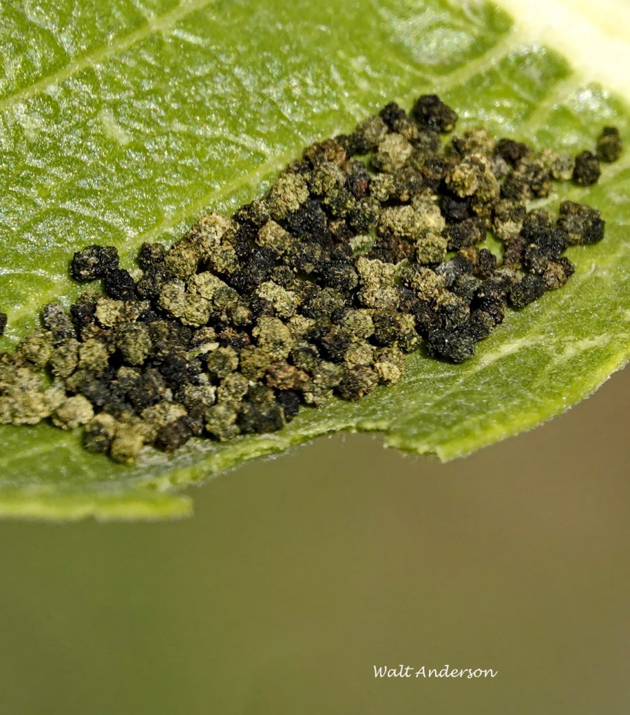 As the plant is devoured, post-digestive bundles (I am trying to be polite) accumulate below the voracious caterpillars. Insect excrement is known as frass. Good entomologists really know their frass.