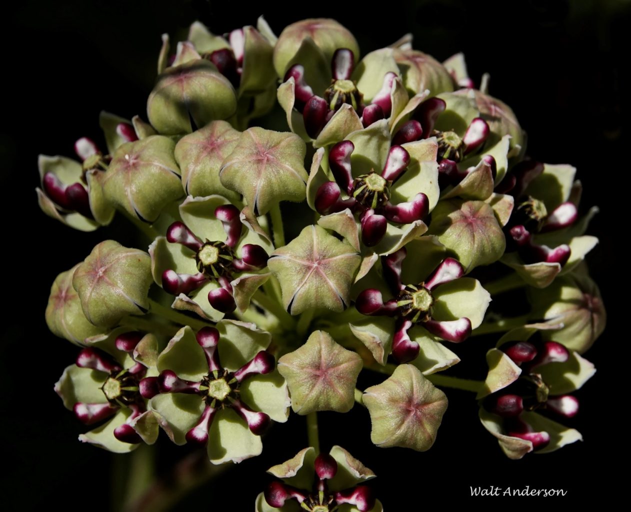Many insects are attracted to nectar in the flower clusters, some of them stunningly beautiful, like this Antelope Horns. Evolution has rigged a trap for the unwary insect. As it crawls around on the flowers, a leg may slip into what is called a stigmatic slit. As the insect tries to free its trapped leg, it picks up a cluster of pollen called a pollinium. When the insect travels to another milkweed of that species, it can deposit the pollinium appropriately, thereby pollinating the flower.