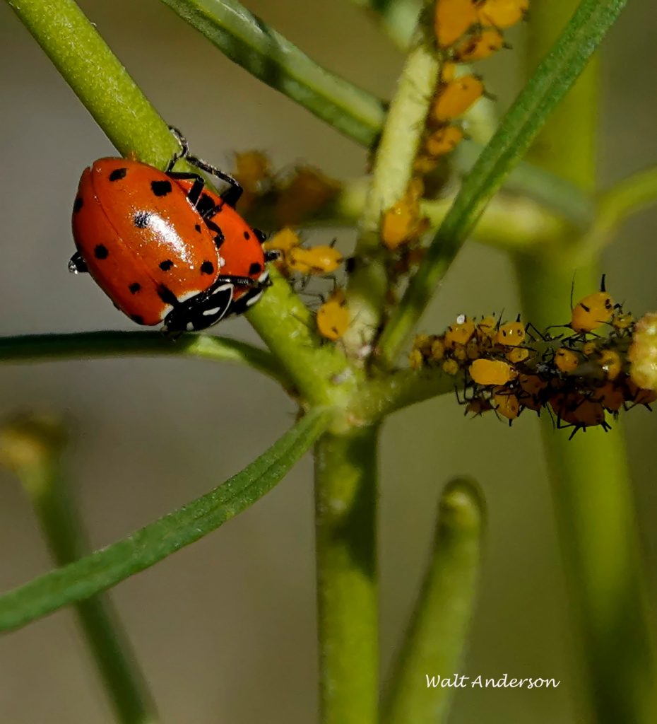 These are Oleander or Milkweed Aphids, native to the Mediterranean region and thus an invasive non-native here. They too sequester cardiac glycosides from the milkweed host, which help repel spiders and other predators, though there are some wasps that parasitize them. They are viviparous and parthenogenetic; that is, they give live birth to their nymphs, which are all clones of the mother aphid (they have no males—the ultimate in women’s liberation). They are sap suckers and can damage the plant. When a colony gets overcrowded or the plant declines too much in its vigor, some individuals grow wings and fly to other plants to start a new clonal colony. Look carefully on the lower left to see one of these winged alates. Also, look for a red and black predator lurking in the flower cluster on the upper left.