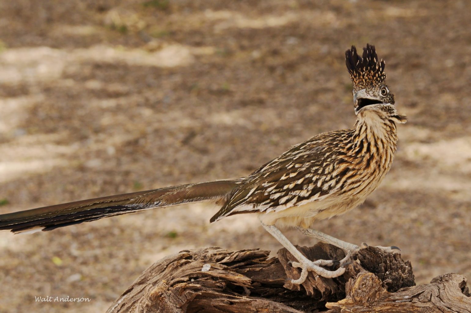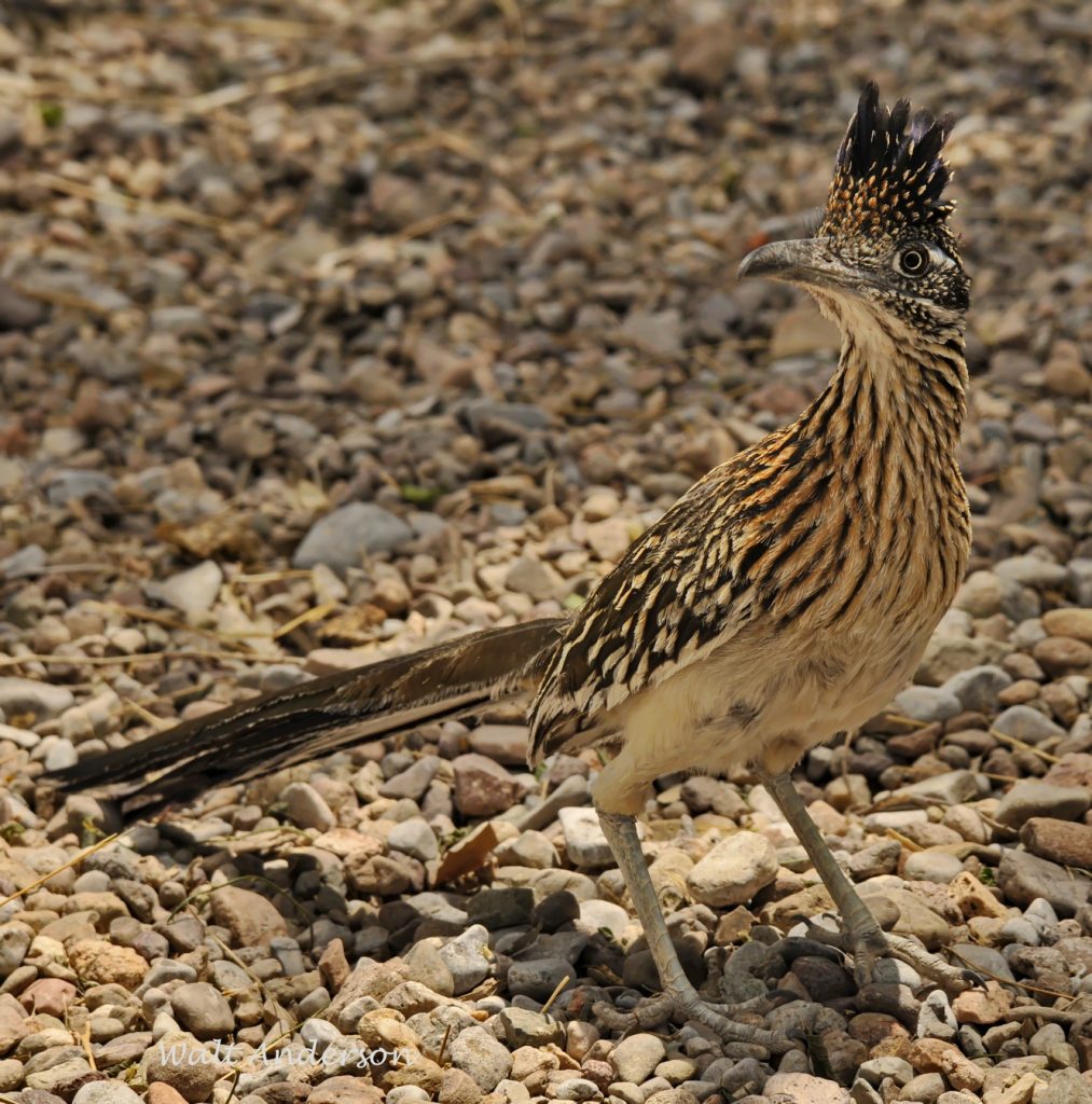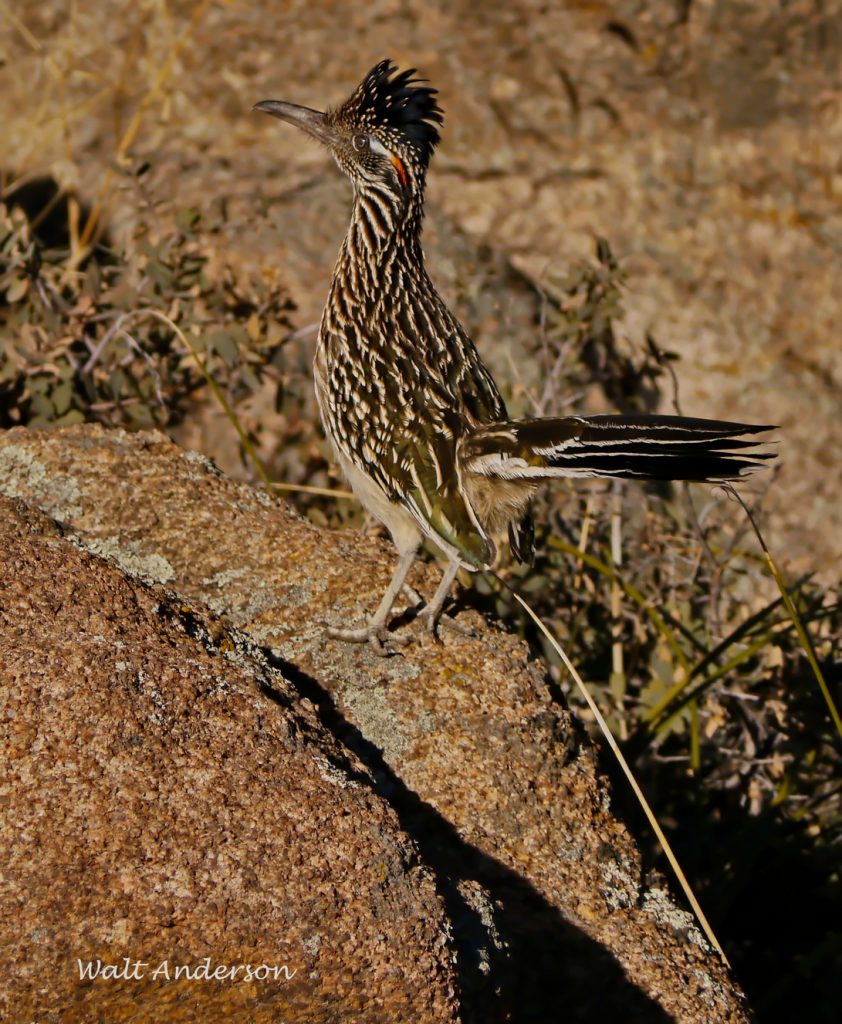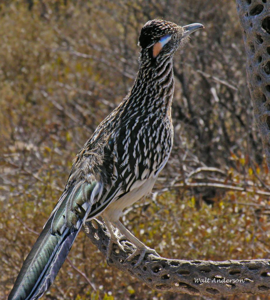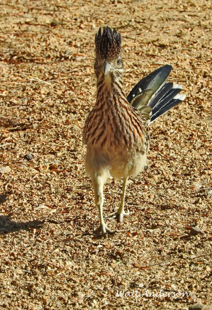 The Greater Roadrunner (it has a Lesser cousin in Mexico) is known to science as Geococcyx californianus, which roughly translates as the “ground-cuckoo from California.” It is a member of the cuckoo family, though its range extends from southern California almost to the Mississippi River in the southern tier of states and well down into Mexico. It is a characteristic dweller of desert and chaparral, though it occurs at higher elevations until it hits denser montane forests, where it is rare. In Arizona, it is widespread below the Mogollon Rim, uncommon above it. It’s New Mexico’s state bird.