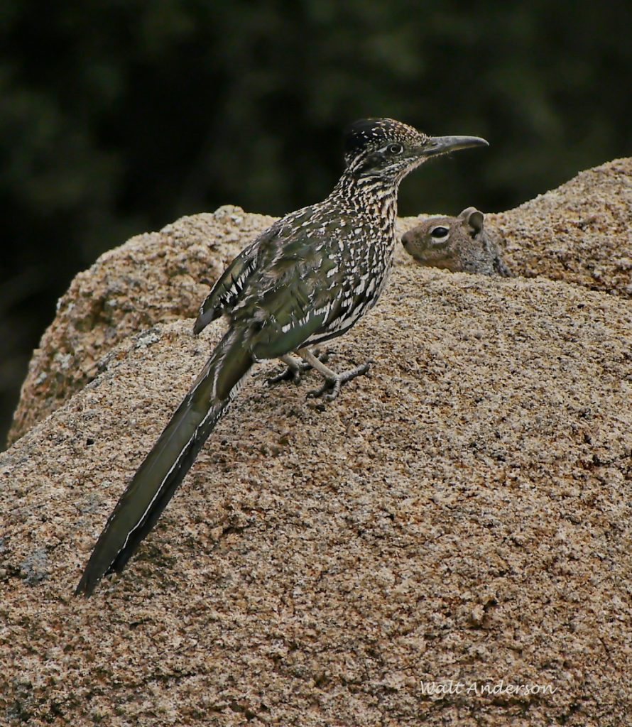 While in the warmer months, insects are a major part of a roadrunner’s diet, the birds can take small mammals, even pocket gophers. Best to keep one’s whiskers underground!