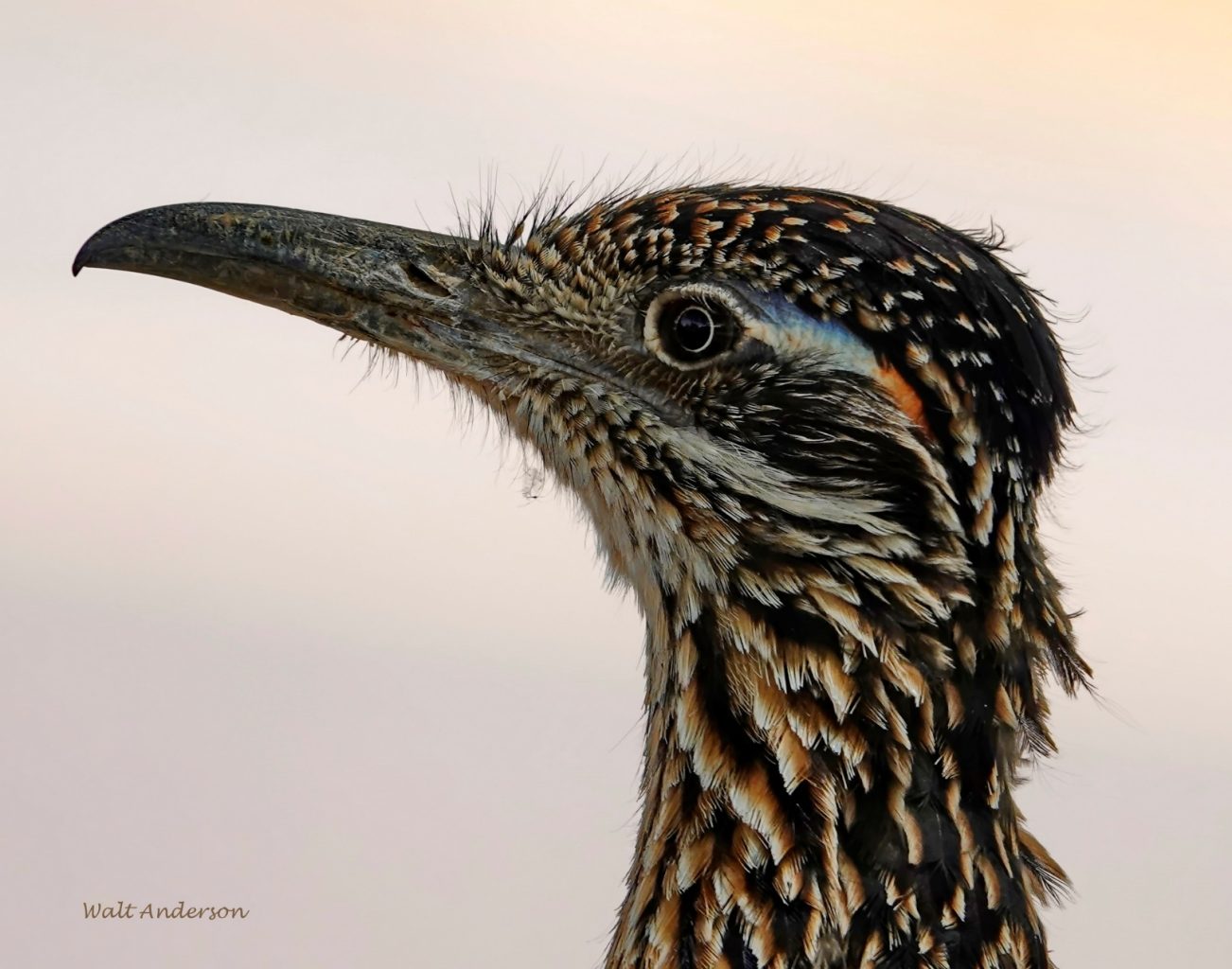 A close view of a roadrunner’s face reveals its bristly character. It also shows the bird’s remarkable eye. The eye is enclosed in a pale orbital ring, and the dark pupil is surrounded by a strange, straw-colored narrow ring in an otherwise brown iris.