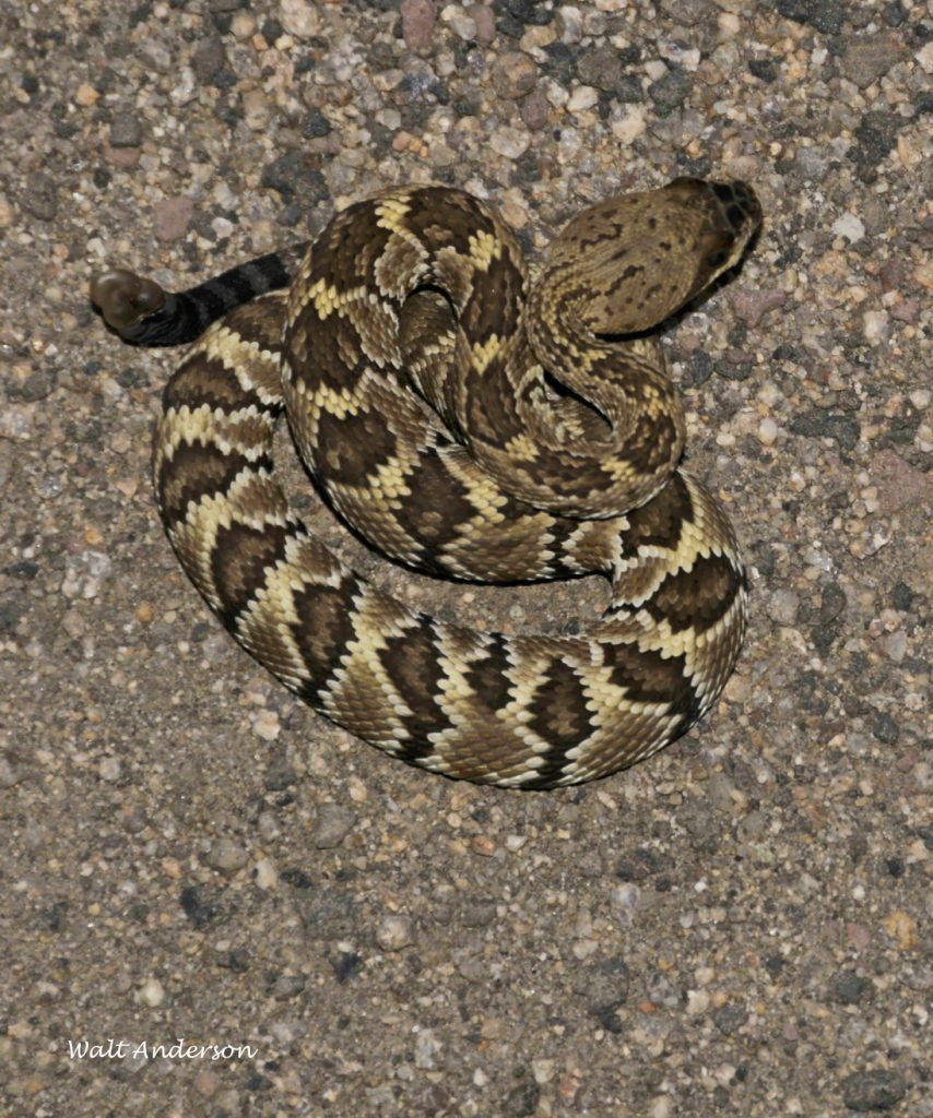 Roadrunners are justly famous for the ability to capture and eat rattlesnakes. You may have seen the action in nature videos, where the bird begins circling the reptile, flashing its wings (perhaps to confuse it), and darting in to strike the snake’s head repeatedly until the snake is incapacitated. A young snake like this Black-tailed Rattlesnake is especially vulnerable.
