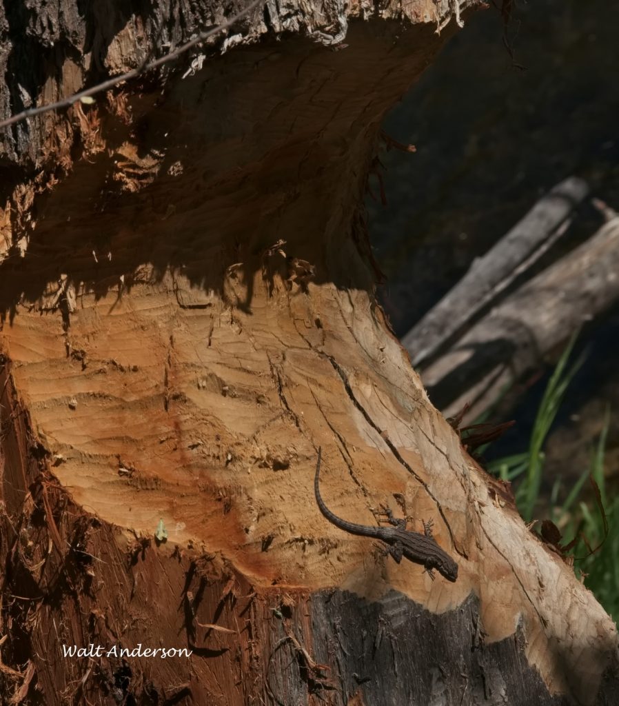 If you look closely, you can see two bugs on the beaver-chiseled tree. They may not realize that the lizard is a sit-and-wait predator that specializes on invertebrates. They can lunge with great speed, and I have seen them leap into the air after insects flying by.